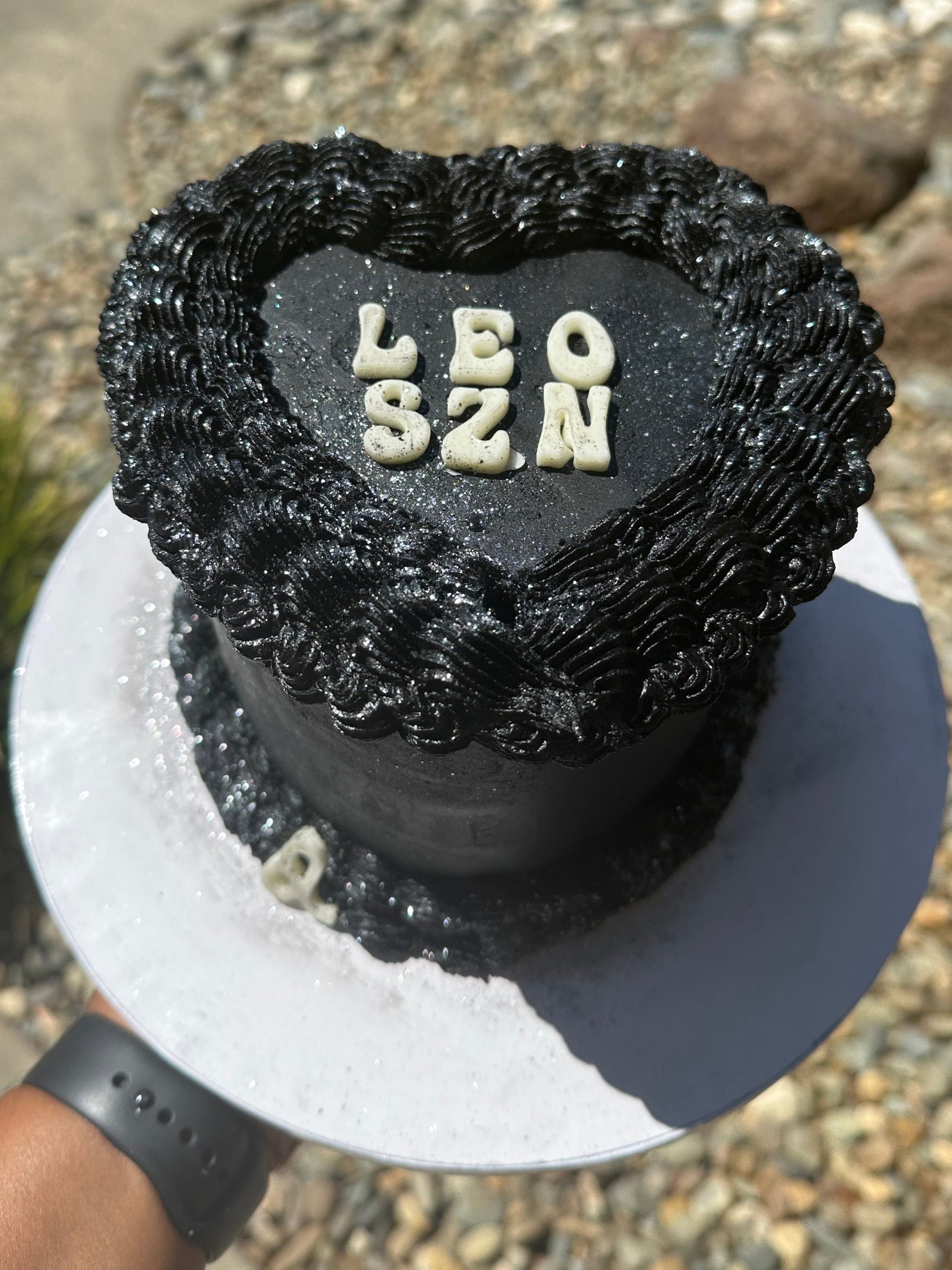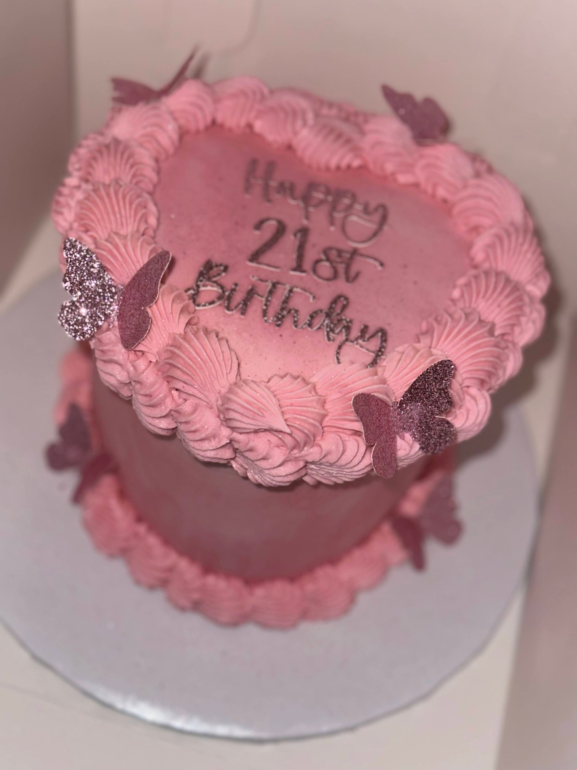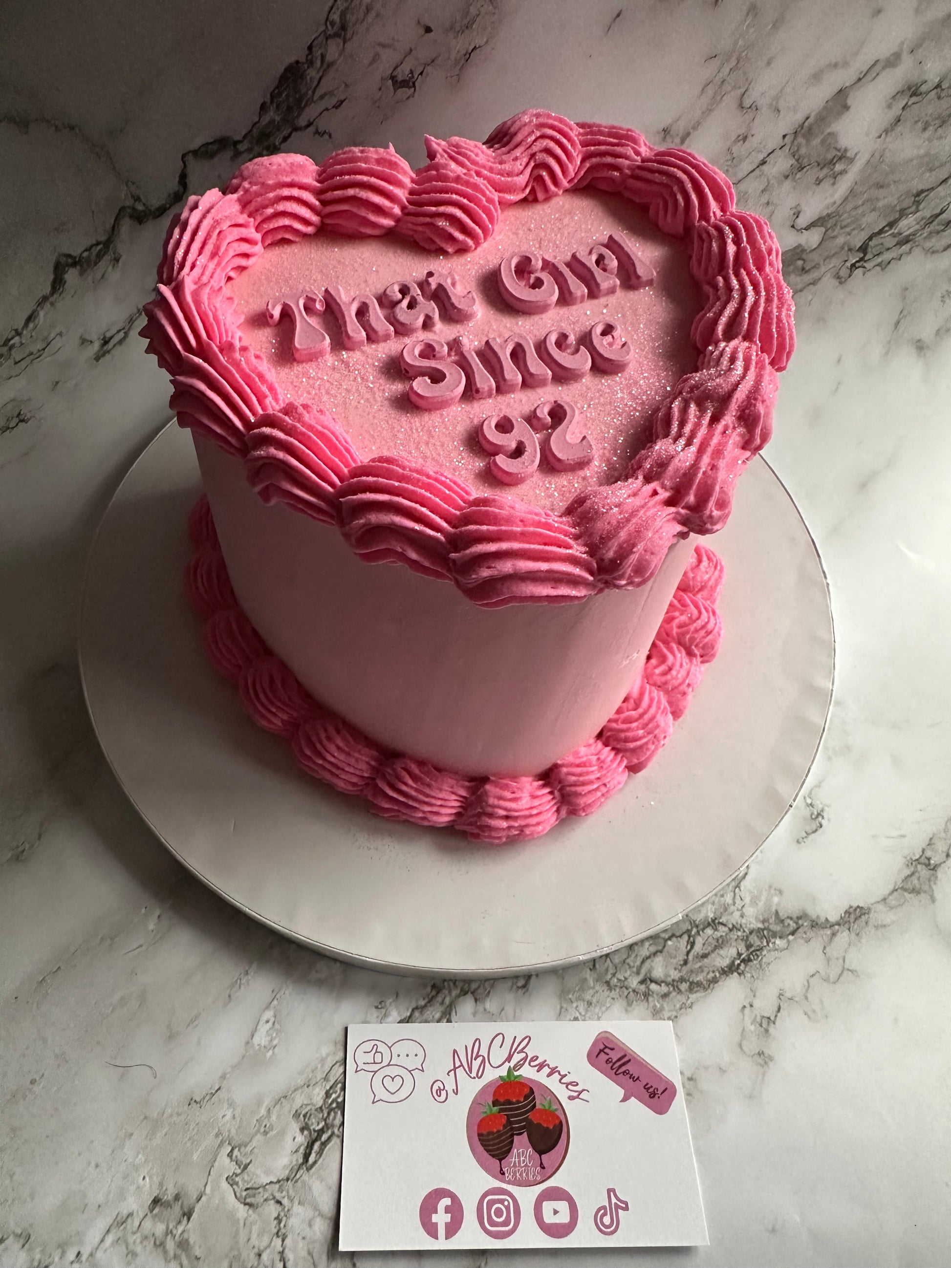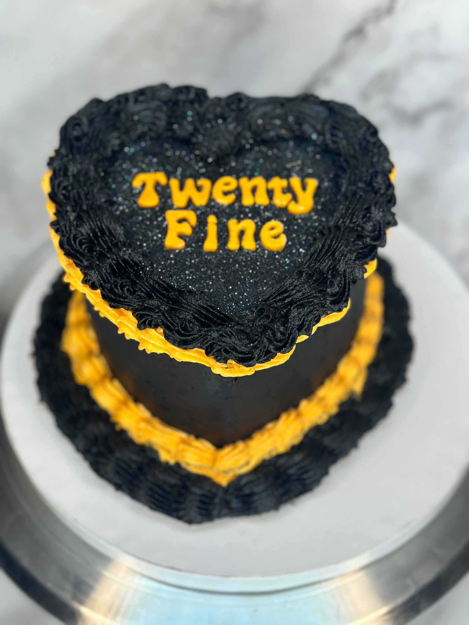 Heart Cake will include a two layer cake in up to two frosting colors, matching glitter (if wanted), & card stock topper (or chocolate mold) with saying/numbers.